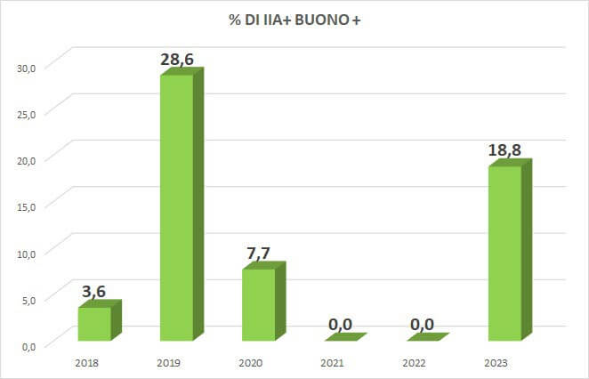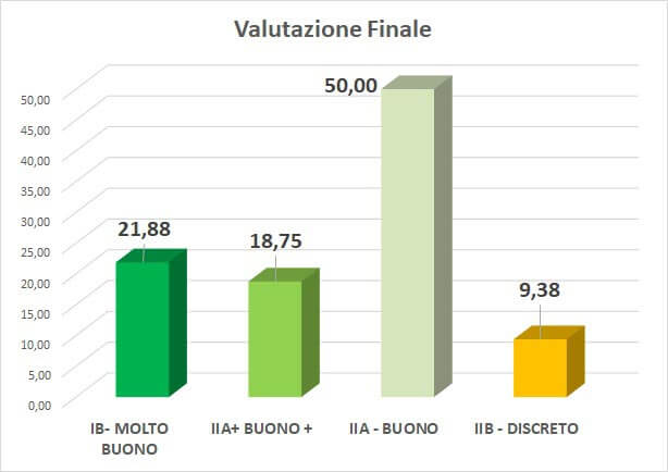 Analizzando le valutazioni finali evidenziate delle schede morfologiche lineari, è emerso che il 21,88% dei soggetti è stato classificato come I Classe – MOLTO BUONO, il 18,75% come II Classe BUONO +, il 50% come II Classe BUONO e solo il 9,38% è stato valutato come categoria IIB – DISCRETO. Tutti questi risultati riflettono chiaramente l’impegno, la dedizione e la profonda comprensione dei criteri di selezione.
