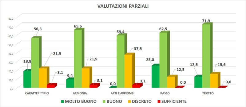 Per quanto riguarda le valutazioni parziali nelle singole voci della scheda lineare, hanno ottenuto un Molto Buono il 18,8% dei soggetti nei caratteri tipici, il 9,4% nell’armonia, il 25% al passo e il 12,5% al trotto. Un’analisi più approfondita ha rivelato anche che negli ultimi anni sempre più soggetti hanno ottenuto un miglioramento significativo nelle voci relative alle andature al passo e al trotto, infatti solo 12,5% ha ricevuto un Discreto al Passo e il 15,6 % al trotto. Questo è un chiaro segno positivo del lavoro svolto dagli allevatori per ottimizzare, non solo le caratteristiche fenotipiche della razza, ma anche quelle funzionali, producendo sempre più soggetti idonei al lavoro, trekking e attitudini sportive. Infatti sempre più soggetti stanno migliorando e riscontrando andature al passo regolari con una buona attività e copertura oltre ad un trotto energico, ampio e con una buona elasticità.