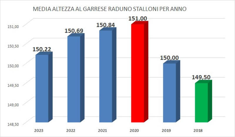 Nel grafico a destra (media altezza al garrese…) sono invece riportati i dati biometrici medi dell’altezza al garrese negli ultimi 6 anni