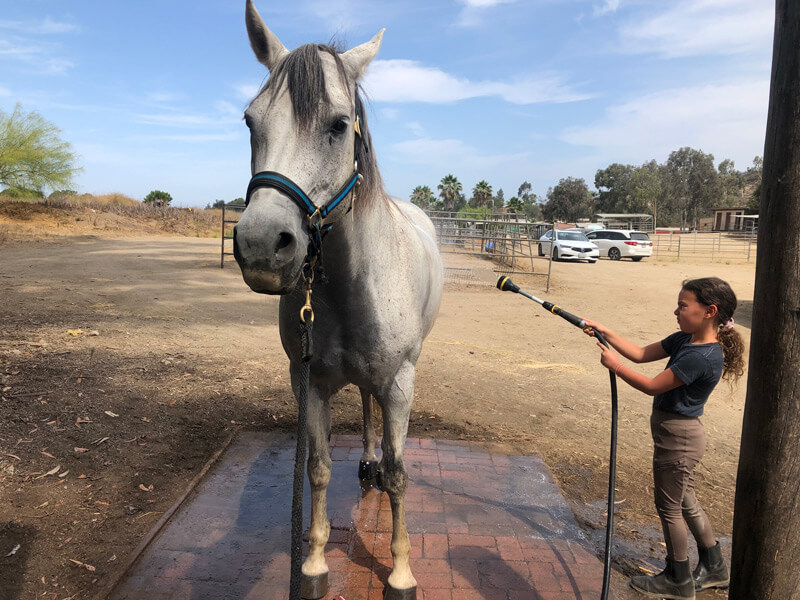 – Considerare attentamente il luogo dove faremo la doccia e assicurarsi che il cavallo possa semplicemente stare fermo nello spazio che abbiamo designato. Nel caso di cavalli con difficoltà ormai esistenti verso la doccia o nuovi a questa esperienza, uno spazio recintato è ideale, perché fornisce la possibilità di lavorare in libertà su un fondo non scivoloso.