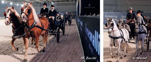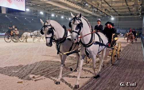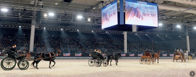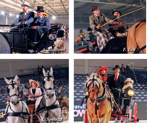 L’emozione è tanta e, nel percorrere il viale della Fiera e nel mettersi in fila in attesa di entrare nell’arena, la tensione è palpabile e non fa neppure sentire il vento freddo della sera. Sulle note del magico Valzer n.2 di Shostakovich le carrozze fanno il loro ingresso ed è subito spettacolo con l’Unicorno di cavalli spagnoli guidato da Alberto Marini affiancato a cassetta dall’elegante Alessandra Gerardini ed in carrozza due serissimi groom in livrea. Dietro a lui l’esperto Francesco Tosi con il suo Break, entrambi attenti a calcolare spazi e tempi con trepidazione e con la consapevolezza che si deve dare il meglio. Il pubblico accoglie con applausi gli attacchi che, uno dopo l’altro, sono in campo. Dal Demi Phaeton di Cesare Sala guidato da Alfio Biasibetti, a Matteo Zucchi, impeccabile cocchiere di servizio con Vis à Vis, alla Wagonette francese con, unica donna alle redini, l’immancabile Ramona Bigatto. E ancora la Tabacchiera di Giuliano Barni, seguita dal Military del sorridente Claudio Ongaro, la bella Dottorina guidata da Antonio Mottin con a fianco Adriana Furno.