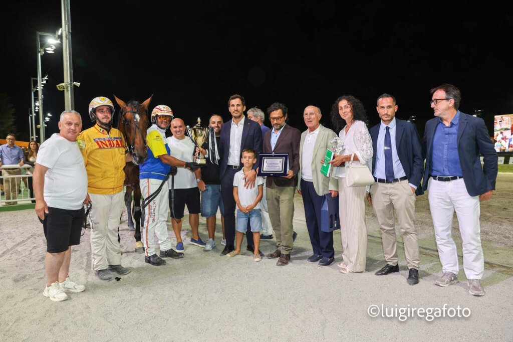 La premiazione del Gran Premio con il Sindaco di Cesena Enzo Lattuca che consegna la coppa ad Alessandro Gocciadoro. l’AD di Hippogroup Riccardo Grassi consegna la targa al proprietario del vincitore