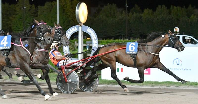 Nella tradizionale prova ad invito, valida come Premio Parco di Pinocchio Collodi alla 5^ corsa, l’errore della favoritissima Emma Dei Veltri, dopo circa 500 metri, ha cambiato volto al confronto: la cavalla di Casillo sembrava sul punto di sfilare al comando sull’accondiscendente Click Bait, ma lo svedese si è ritrovato al comando e Alessandro Gocciadoro che ha deciso di giocarsela in testa: il figlio di Cantab Hall si è potuto permettere un primo chilometro in 1.16.1 scortato da Dakovo Mail, poi da cavallo di classe ha messo in campo una chiusa veloce e in retta è sfuggito alla muta dei rivali a media di 1.13.4. Dotato di uno scatto micidiale (è andato di pacca in testa dal 6), Click Bait è il classico cavallo perfetto per la distanza del miglio in pista piccola; d’altronde lo scorso anno ha trionfato nel Campionato Europeo e al Sesana non era al 100% e, come dichiarato nel dopocorsa dal suo preparatore, avrebbe preferito correre di rimessa. Così restando, però, Click Bait si annuncia tra i principali protagonisti del Gp Città di Montecatini. Alle spalle del vincitore ha fatto bella figura Edy Girifalco Gio, che dopo aver agito in seconda pariglia in scia a Dakovo Mail, ha chiuso forte nonostante il ritmo veloce e ha regolato il rivale per il secondo posto. Dakovo Mail ha confermato che la vittoria di Cesena non è stata frutto del caso. Quarto l’appostato Eclissi Di Re Dr su Cuba del Duomo, mentre Emma dei Veltri dopo l’errore si è limitata a “lavorare” in coda insieme a Vincero’ Gar, a sua volta in errore nel tentativo di partire forte.