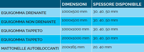 Solo stagionalmente è possibile sollevare le lastre, lavarle ed esporle al sole per un’asciugatura completa. Le pavimentazioni nella versione Drenante sono vendute nella formato unico 1000×500 mm con diversi spessori da 30, 40 e 50 mm ognuno studiato per diverse esigenze. Possono essere sagomate facilmente con un seghetto elettrico alternativo per adeguarsi a ogni forma e superficie.