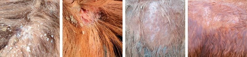 In foto, alcuni esempi di dermatite sul pelo dei cavalli.