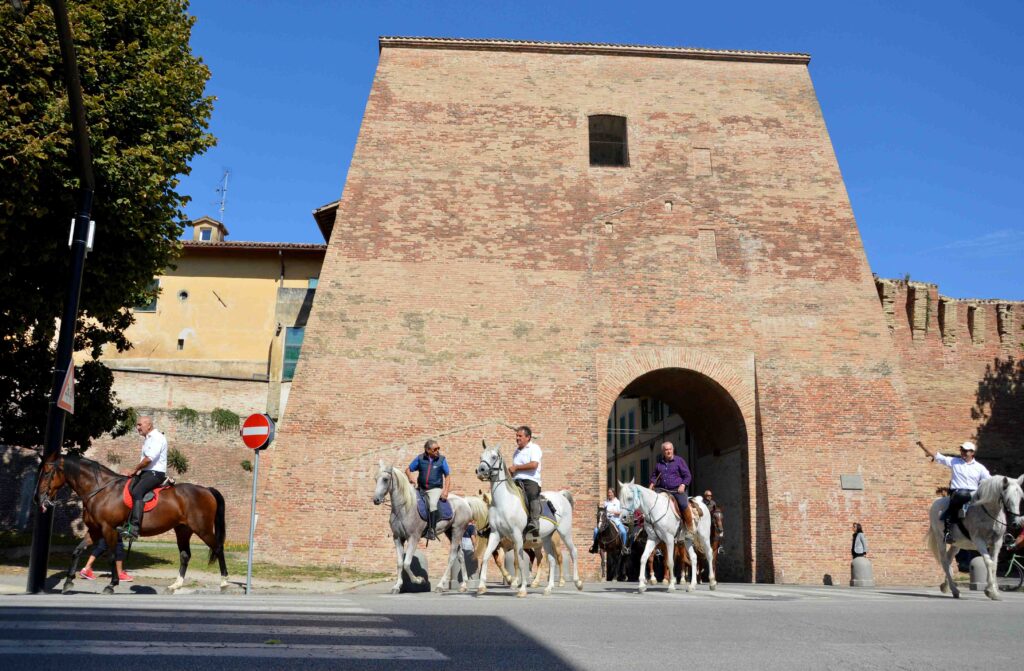 Cavalli meravigliosi che, dopo aver attraversato ieri alcuni degli scorci naturalistici più suggestivi dell’asta del Tevere e delle campagne circostanti, lungo l’itinerario di stamattina hanno aggiunto la loro bellezza alle testimonianze artistiche e architettoniche caratteristiche della città, lambendo la collezione delle opere di Alberto Burri degli ex Seccatoi del Tabacco, passando vicino alle mura urbiche e sotto alcuni dei palazzi rinascimentali di maggior pregio storico, gettando uno sguardo alla Pinacoteca comunale e ai tesori di Raffaello e Signorelli custoditi nel museo.