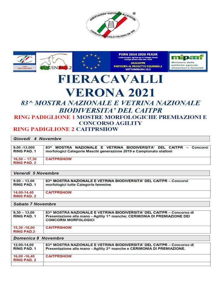 Se a questa catena di manifestazioni aggiungiamo le manifestazioni di Pescasseroli del maggio scorso, il nuovo Meeting del Veneto di fine luglio ed il Meeting tecnico tenuto in Puglia ai primi di agosto, e se si aggiunge che subito dopo Fieracavalli la stagione si chiuderà con il tradizionale evento di Accumoli in cui ANACAITPR sarà nuovamente impegnata come supporto tecnico, si può ben dire che il 2021 è stato un vero e proprio “anno della ripresa” dove è emersa una forza d’iniziativa degli allevatori dei diversi territori d’allevamento veramente straordinaria che ha sempre trovato in ANACAITPR il naturale supporto e la necessaria collaborazione tecnica. Ma questo è il preludio di un Evento di grande livello come FIERACAVALLI che, da sempre, è vocata a riassumere e a sintetizzare in quattro giornate tutto il lavoro svolto nei diversi territori d’allevamento. E FIERACAVALLI 2021 per il CAITPR si proporrà proprio così. Dopo alcune settimane di titubanza ed incertezza circa la cornice organizzativa post COVID, l’Evento CAITPR è letteralmente decollato. Oltre 60 i soggetti a Catalogo iscritti nelle diverse attività: dai classici Concorsi di modello ed andature, alle Prove di presentazione-agility sino al CAITPRSHOW.