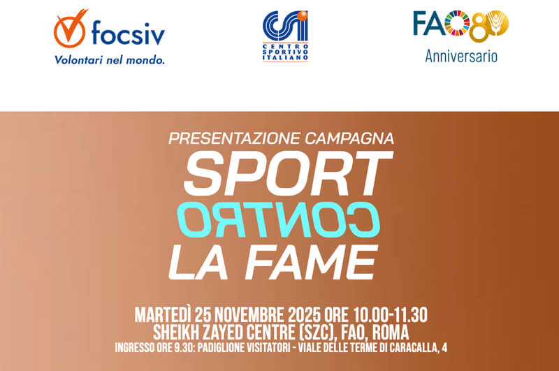 Roma, 19 novembre 2025 – “Lo sport nutre la speranza”: è questo lo slogan della campagna “Sport contro la fame” promossa dalla Focsiv, Federazione degli organismi di volontariato internazionale di ispirazione cristiana, e dal Centro Sportivo Italiano, in collaborazione con l’Organizzazione delle Nazioni Unite per l’Alimentazione e l’Agricoltura (FAO) e con l’obiettivo di sostenere progetti contro la fame e la malnutrizione nei Paesi più svantaggiati. Presso il quartier generale della FAO a Roma, l’iniziativa sarà presentata martedì 25 novembre alle ore 10:00.
