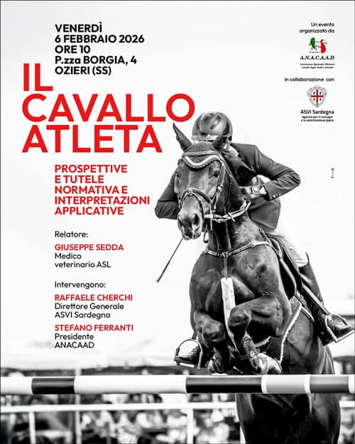 Venerdì 6 febbraio la sede Asvi in Piazza Duchessa Borgia a Ozieri ospita a partire dalle ore 10 il convegno dal titolo “Il Cavallo Atleta: Prospettive, Tutele e Normativa – Un Futuro Sostenibile per lo Sport Equestre”