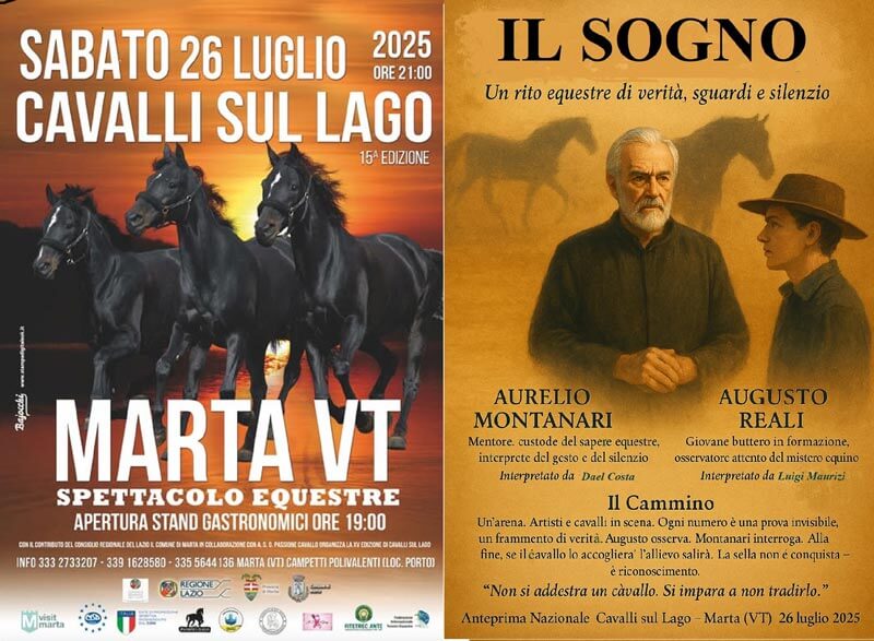 Organizzato congiuntamente dalla ASD Passione Cavallo e dal Comune di Marta, in preziosa collaborazione con Enti e Istituzioni pubbliche e private, questo spettacolo valorizza ed unisce l’antica arte del buttero alla magia delle performance artistiche con i cavalli. L’evento racconta un percorso emozionale che celebra la profonda connessione tra uomo e cavallo e la resilienza di un mondo rurale che intende preservare la propria identità.