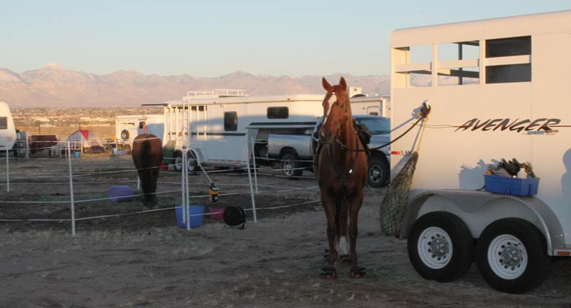 Nella mia esperienza, ho portato i miei cavalli principalmente a gare di endurance e li ho tenuti in recinti elettrificati per la notte, il che ha dato loro spazio per muoversi e dormire invece di essere legati e impossibilitati a muoversi. Ho sempre messo a disposizione un grosso secchio d’acqua e un secchio di fieno.