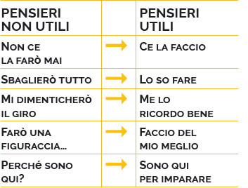Cambia i tuoi pensieri da pensieri non utili in pensieri utili. Alcuni esempi che ho sentito da alcuni atleti e come puoi cambiarli: