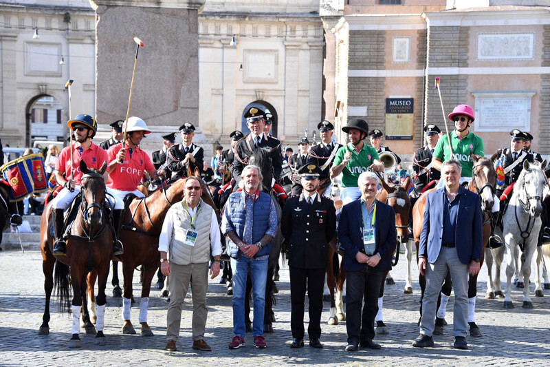 Quando la Fanfara dei Carabinieri a Cavallo comincia a suonare, in Piazza del Popolo, tutti i turisti che in quel momento stanno passando per le vie del centro si fermano, si voltano e iniziano a filmare il momento. Davanti, ad accompagnare il corteo, ci sono il segretario generale della FISE Simone Perillo, il responsabile del dipartimento polo Alessandro Giachetti, il Ct della Nazionale Franco Piazza e un ospite d’eccezione: Marcelo Martín Giusto, ambasciatore argentino in Italia. Se in Argentina il polo è una religione, in Italia sta diventando una disciplina sempre più conosciuta e sempre più a portata di appassionato grazie proprio all’arena polo, formula 3X3 giocabile anche su campi ridotti rispetto alle misure del campo da polo tradizionale.