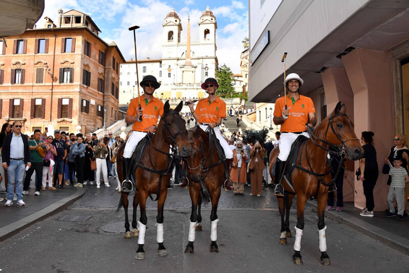 I cavalli, con in sella i protagonisti del torneo ‘griffati U.S. Polo Assn., sponsor tecnico di Italia Polo Challenge, iniziano a percorrere Via del Corso: ai lati si formano file di curiosi, che cercano di guadagnarsi la posizione per lo scatto migliore da condividere sui social o nelle chat degli amici. Si parlano tutte le lingue, intorno ai cavalieri di Italia Polo Challenge: gli aggettivi però sono gli stessi: “Wonderful”, “Che meraviglia”. Da Via del Corso, la svolta a sinistra verso Via Condotti, sede dell’omonima associazione da poco presieduta da Valerio Lucci ma da sempre attiva – sin dalla prima edizione del 2019 – e che con la sfilata ha contribuito in maniera importante alla promozione del torneo. Piazza di Spagna sullo sfondo, uno scenario da favola, una passerella sold out proprio come tutto esaurite furono le tribune del Galoppatoio – a ingresso libero – nei giorni del torneo.