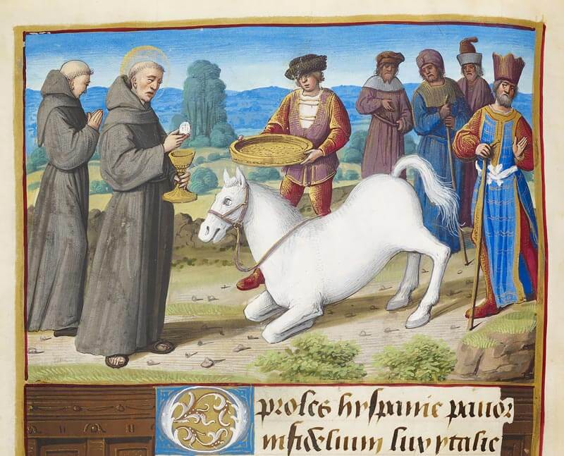 Ma l’asino “che si inginocchia” più famoso della tradizione italiana è sicuramente quello del miracolo di Sant’Antonio da Padova (Liber Miraculorum): si tratta di una narrazione popolare molto nota, in cui un asino si inginocchia davanti all’Ostia consacrata.