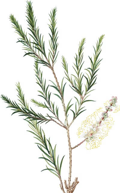 La Melaleuca (nome scientifico: Melaleuca alternifolia), conosciuta anche con il nome di Tea Tree, ossia Albero del Tè, è una pianta appartenente alla famiglia delle Mirtacee, originaria dell’Australia, che cresce presso ruscelli e paludi. Ha foglie lineari lunghe dai 10 ai 35 mm, i suoi fiori bianchi sono in grappoli lunghi dai 3 ai 5 cm e i frutti, legnosi e a forma di coppa, di diametro di 2-3 mm. Dalle foglie si estrae un olio essenziale dal forte odore, considerato un potente antisettico, antimicotico, antibatterico e antivirale, anche con proprietà deodoranti e conservanti.