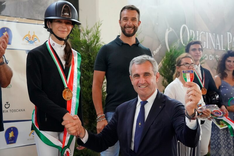 L’amazzone laziale ha ricevuto dalle mani del Presidente della FISE, Marco Di Paola, lo scudetto tricolore che, apposto sulla tenuta regolamentare, consente di individuare il detentore del titolo.