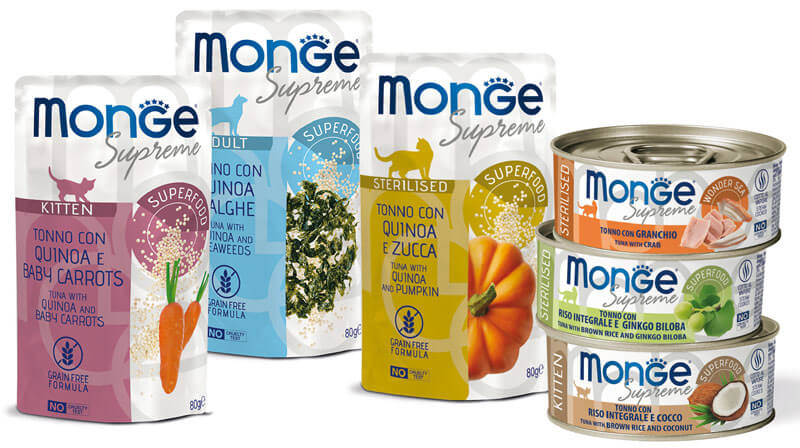 Monge Supreme è preparata con squisiti pezzi di pesce ad elevato valore biologico, resi appetibili e digeribili mediante la cottura a vapore che mantiene intatti tutti i sapori. Le ricette con tonnetto striato, selezionato con cura e pescato nel rispetto di ambiente e biodiversità, sono arrichite di superfood: tante verdure e tanti frutti, come ad esempio babycarrots, spinaci, piselli, goji, mirtilli rossi, gingko biloba ecc. ma anche quinoa, alghe, riso integrale e pesci selezionati, come spigola, cozze, triglia, granchio, calamari, spigola e orata.
