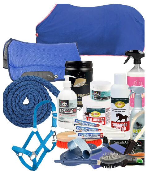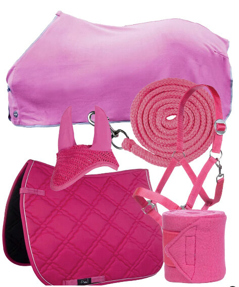 25 PEZZI – Monta inglese Sottosella inglese + coperta in pile + lunghina + cavezza nylon + cuffia a rete antimosche + fasce in pile + prodotti e accessori per il benessere e la pulizia del cavallo. Coordinato in vari colori a scelta 35% di risparmio
