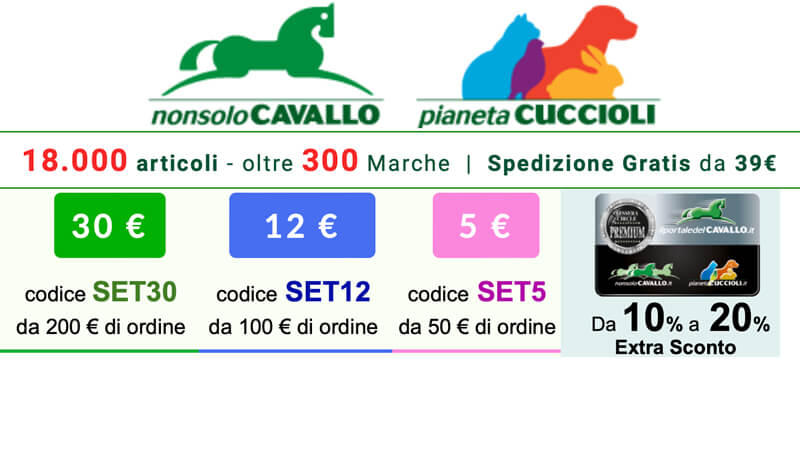 Il Portale del Cavallo con NonsoloCavallo, PianetaCuccioli, il bimestrale Informa, la WebTV e i nuovi Corsi Online, sono il grande network italiano rivolto a chi ama il cavallo e gli animali da compagnia. Vuoi promuovere la tua attività o vendere i tuoi prodotti sul nostro e-shop? Chiama il numero 0362 990913 o scrivi una email a: redazione@ilportaledelcavallo.it. Il network pubblicizza la tua azienda, il tuo sito e i tuoi prodotti a migliaia di persone ogni mese, questo consente di poter realizzare campagne di marketing verticalizzate e integrate tra il mondo digitale e il mercato reale.