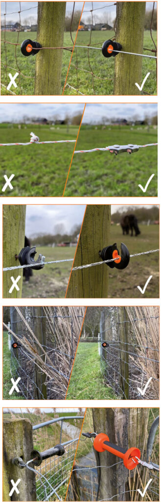 - Collegamenti incorretti > I fili conduttori di una recinzione elettrificata sono spesso annodati tra loro. Questi nodi sono causa di una minor conduttivitá del filo stesso. Pertanto, utilizza sempre un connettore adatto o sostituisci il filo, se necessario. Inoltre, i collegamenti sbagliati a volte sono anche causa di scintille. Queste scintille danneggiano la recinzione e la fanno arrugginire più rapidamente.