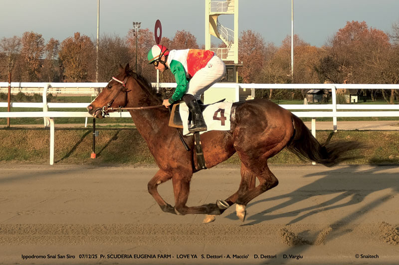 Per i cavalli velocisti, invece, c’era a disposizione un handicap sui 1.200 metri di discreta categoria per i 3 anni ed oltre valida per il Premio Eugenia Farm, risolto con un piglio importante da Love Ya, che manteneva una perfetta posizione in partenza e quando allungava non lasciava nessun tipo di scampo, autoritariamente, neppure ad Artaxas, che centrava l’ennesimo piazzamento. Molto atteso anche il Premio Scuderia dell’Elfo, l’handicap che chiudeva la prima e storica giornata di galoppo sulla pista in sabbia all’Ippodromo Snai San Siro di Milano, non tanto per la categoria, di ordinaria amministrazione, quanto per la distanza, il doppio chilometro allungato, per intuire quante doti di stamina ci volessero per affrontarlo; l’impressione è stata positiva in attesa di responsi più consistenti, con vittoria finale per Fleant, declassato nella categoria e con il suo passo più vigoroso che gli consentiva di sottomettere la coraggiosa Red Tail.