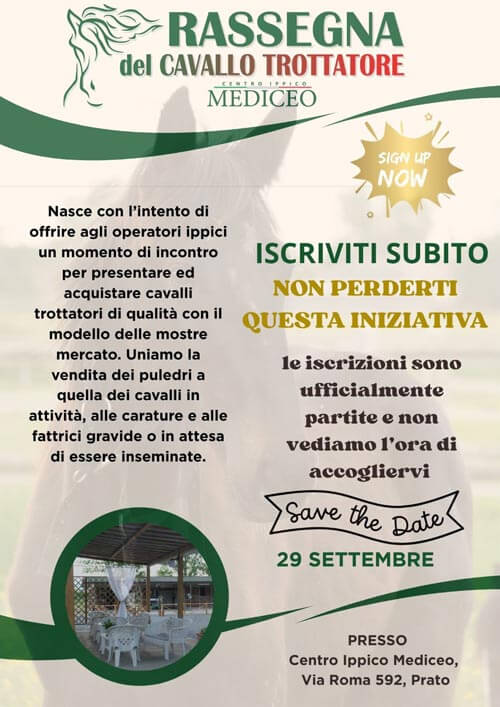 Rassegna del Cavallo Trottatore realizzata insieme agli amici del Centro Ippico Mediceo di Prato in data 29 settembre 2025 e le cui iscrizioni scadono il prossimo 5 luglio.