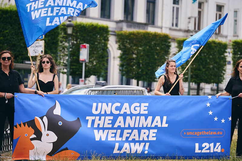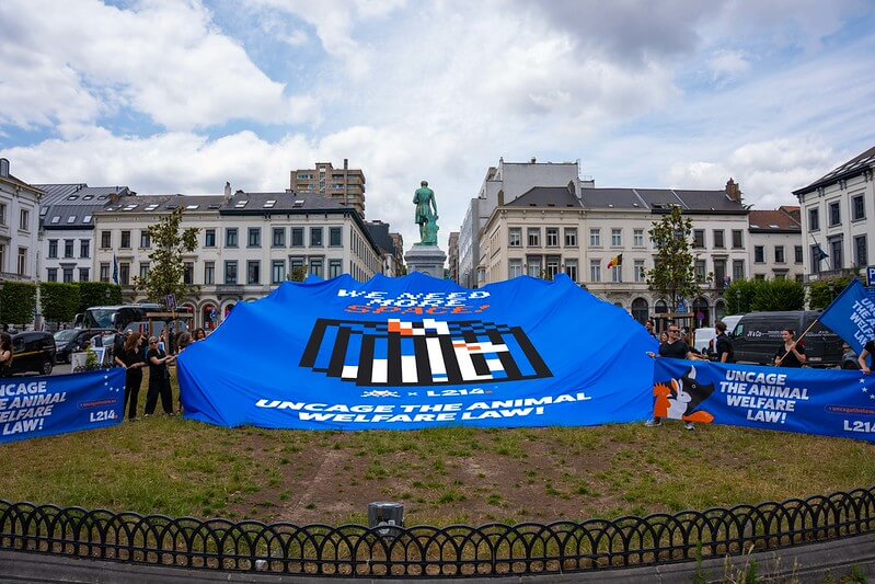 Uno striscione dell’artista è stato esposto in Place du Luxembourg per denunciare l’allevamento intensivo di animali, mentre le associazioni chiedevano ai parlamentari europei di impegnarsi per una riforma ambiziosa della legislazione UE sul benessere animale.