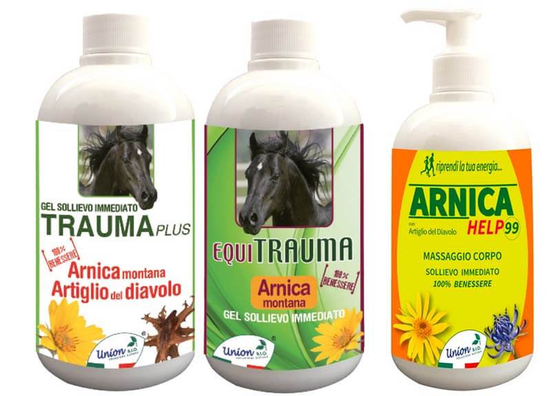 EQUITRAUMA E TRAUMA PLUS. Gel naturale all’Arnica utili per defaticare muscoli, tendini e articolazioni dopo allenamenti e gare. Prontamente attivi su edemi ed ematomi, possono essere usati in modo facile e sicuro sui cavalli post lavoro.