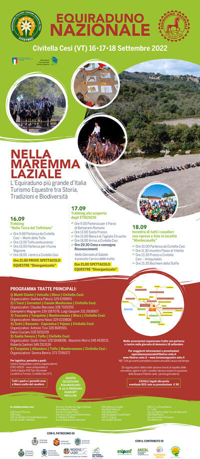 La Federazione Italiana Turismo Equestre e TREC-ANTE organizza, nei giorni 16 – 18 settembre 2022, lo storico “Equiraduno Nazionale giunto alla 47”edizione con l’obiettivo di promozione dei territori italiani e del turismo a cavallo.
