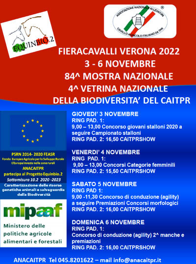 Oltre alla partecipazione dell’Associazione Italiana Allevatori-A.I.A. e di FedAna (Federazione delle Associazioni Nazionali di Razza e Specie) cui aderisce Anareai (Associazione Nazionale Razze Equine e Asinine Italiane) ed Ana-Enti selezionatori come Anacaitpr (Associazione Nazionale Allevatori Cavallo Agricolo Italiano da Tiro Pesante Rapido) e Anacrhai (Associazione Nazionale Allevatori Cavallo di Razza Haflinger Italia), che terranno rispettivamente l’84a Mostra Nazionale e 4a Vetrina della Biodiversità (Caitpr) ed il “Caitpr Show“ e la dimostrazione “Haflinger Folie”; si segnala quella dell’Anam (Associazione Nazionale Allevatori Cavallo Maremmano), che eleggerà il “Best in Show 2022” ed effettuerà la Finale del Campionato Nazionale di Morfologia Anam. Sempre molto attesa e interessante la passerella delle razze italiane a limitata diffusione e del cavallo Murgese, oltre al Carosello Italiano-Parata delle razze italiane, presentate dallo speaker Nico Belloni, regista storico degli eventi A.I.A.-Italialleva. Lo show dei nostri cavalli sarà presentato, sempre al Padiglione 2, nel “Gala Italiano”.