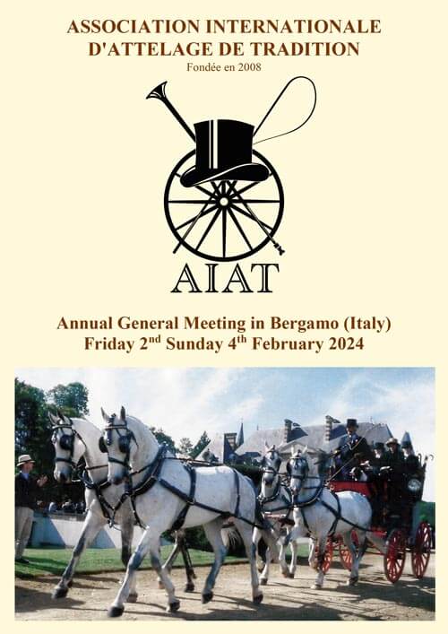 Il primo evento nel calendario GIA 2024, anno in cui si celebra il Cinquantesimo dalla Fondazione del Gruppo Italiano Attacchi avvenuta il provincia di Bergamo nel 1974, sarà l’ospitare l’Annuale Assemblea dell’AIAT (Association Internationale d’Attelage de Tradition), della quale il GIA è membro per l’Italia, e proprio a Bergamo.
