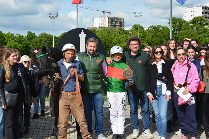 Andrea Farolfi e Demetrio, vincitori del clou di giovedì 18 maggio, sono stati premiati dalla professoressa della facoltà di Medicina – Veterinaria di Parma Ilaria Vecchi, accompagnata da alcuni studenti presenti all’Arcoveggio per una lezione “sul trotto”.