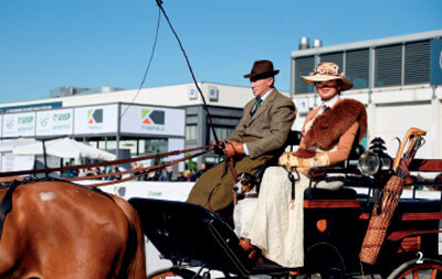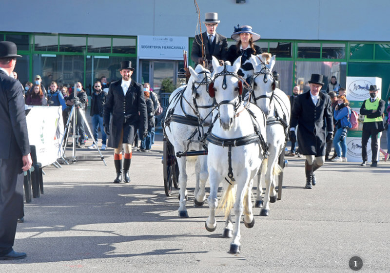 Ed ecco le pariglie: dalla lontana Sicilia con un sorriso di soddisfazione Giancarlo Russo, alle redini di una pariglia di KWPN attaccata a un Dog Cart; non poteva mancare un pezzo firmato Cesare Sala, un pregiato Demi Phaeton attaccato a una pariglia di Murgesi dal manto grigio, con finimenti di classe e, non a caso, in carrozza è Chiara Moirano, a cassetta Alfio Biasibetti e groom Claudio Alpaton. Novità per Giuseppe Usai, che a Verona vuol sempre stupire, con pariglia di Lusitani e un Phaeton Siamese della prima metà dell’800 firmato sugli assali dal costruttore torinese Cantone. Addirittura dalla Svizzera, per la prima volta in Fieracavalli, Albert Sporrӓdli alle redini di una pariglia di Franches Montagnes con elegante Klapp Phaeton firmato Geissberger, da lui restaurato e a fianco Ruth Wünderlin Messmer. Applausi per Matteo Zucchi con pariglia di Haflinger e Tabacchiera di produzione svizzera e per Luigi Spatuzzi con elegante equipaggio e Break Ungherese. Una bella figura per l’ultima pariglia di Muriel Franco alle stanghe di una Tabacchiera e per il delizioso Hackney, attaccato a un minuscolo Americane di produzione olandese, presentato da Alberto Tosi.
