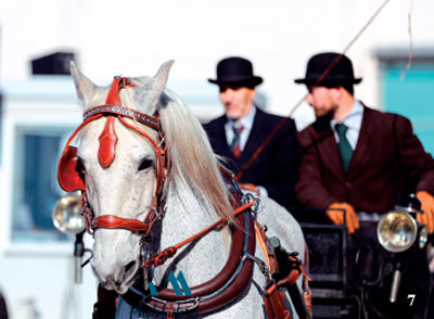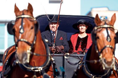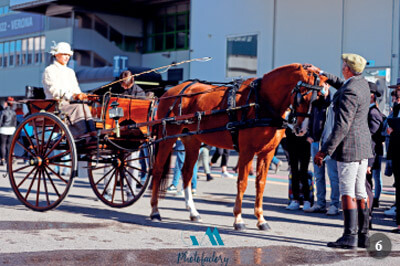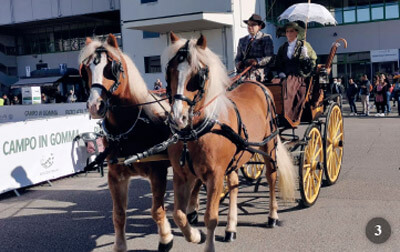 A seguire, Antonio Mottin presentava la sua Dottorina, vettura di inizio ‘900 firmata da Nicola Toscano di Castions (UD), accompagnato in carrozza da Monica Dal Bianco. Sempre elegantissima, Katia Bertocco era alle redini di un ispano-arabo attaccato a un Militarino in legno naturale di Bassi (BO) e ancora, signora delle redini lunghe, Ramona Bigatto spiccava in abito rosso sulla sua Wagonette scura di produzione francese della fine dell’800 e un Comtois alle stanghe. In attacco singolo, con un bellissimo Frisone, Giampaolo Taino, che presentava un vanitoso Duc de Dame risalente alla metà dell’800 e restaurato con precisione e attenzione dallo stesso guidatore. A cassetta di un Break in legno dell’Ottocento, attaccato a singolo Murgese, era Leonardo De Pascalis con tutta la famiglia, mentre sempre con un singolo Murgese Salvatore Melis avanzava su una Dottorina dell’800 di produzione svizzera.