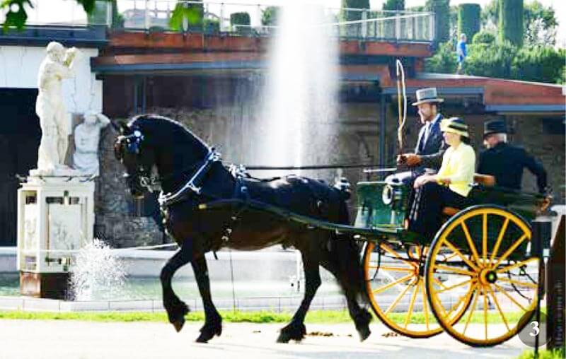 Di queste carrozze due attaccate a Pony, una in singolo e l’altra in pariglia. Per quanto riguarda i cavalli, avevamo 12 singoli (uno dei quali era un cavallo da tiro pesante), 8 pariglie, con la particolarità di averne una à la Demi D’Aumont, attacco che prende il nome dal Duca di Francia D’Aumont, che amava questa bardatura. Questo modo di attaccare è di origine militare e molto utilizzato anche nei postali, entrambi gli usi sono dovuti allo stesso motivo: la velocità di sganciare e riattaccare i cavalli, nel primo caso a pezzi di artiglieria da utilizzare sul fronte e, nel secondo, per il cambio di cavalli nei lunghi viaggi.