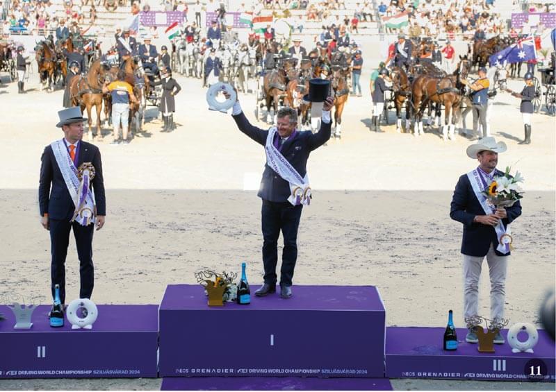 Sulle tre prove Luca Cassottana si confermava a metà classifica (nel dettaglio:19esimo nel Dressage, 26esimo in Maratona e 13esimo nei Coni) un risultato che in questa categoria per l’Italia da molto tempo non si raggiungeva. Un grazie di cuore a Luca! Gli ospiti ungheresi, nonostante le speranze di una medaglia, hanno concluso al quinto posto. Jöszef Dobrovitz ha impressionato il pubblico con una prestazione emozionante nei coni, sottolineando l’eccezionale organizzazione dell’evento e la calorosa accoglienza del pubblico ungherese. A fine gara Exell ha dichiarato: «È stato fantastico! Merita congratulazioni speciali anche Tor. È impressionante vedere come tutto sia andato bene, soprattutto considerando che avevamo solo due membri nella squadra. Finalmente abbiamo ottenuto una medaglia mondiale dopo averci provato per tanto tempo.» Bram Chardon ha detto: «La preparazione a casa è stata fondamentale e abbiamo fatto le scelte giuste, portando alcuni cavalli nuovi che hanno dato un impulso extra nella maratona e nei coni. Dopo una stagione difficile, questo è il miglior risultato possibile.»