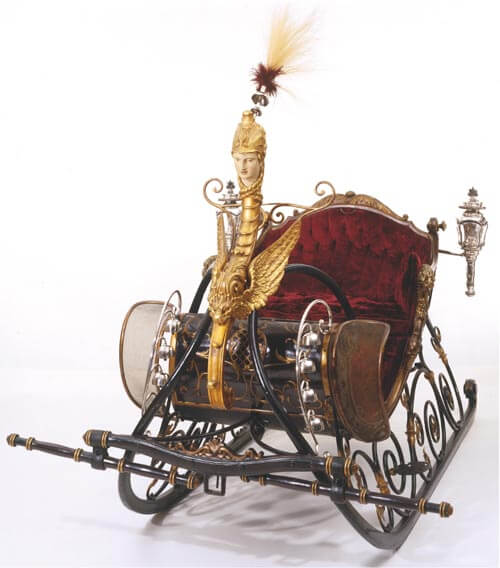 Questa magnifica slitta svizzera del XIX secolo dimostra quanto fosse importante per un cittadino di Basilea avere un “traineau riche”. Era del figlio del famoso ricercatore JJ Bachofen Sr. conosciuto per le sue teorie sul matriarcato preistorico nel suo libro Mother Right ed esperto di diritto romano. Marito e moglie si sedevano davanti nella slitta, con un servitore dietro di loro.