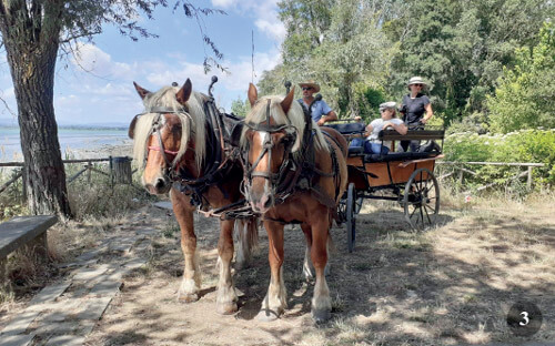 La carrozza ha attraversato la riserva naturale di Montepulciano che, situata nella Valdichiana Senese, al confine con l’Umbria, tutela un prezioso mosaico di ambienti umidi di rilevante interesse naturalistico. Sosta sul lago dopo qualche ora per foto e un riposo breve, perché l’equipaggio era molto curioso di procedere, specie il giovane passeggero che, sotto l’attento occhio del driver, ha provato l’ebbrezza della guida senza voler smettere… Tuttavia il percorso fra piccoli borghi e sentieri bianchi non era così lungo e la sosta per il pranzo è avvenuta in un graziosissimo agriturismo, perso nel verde, in località Pozzuolo di Castiglion del Lago, dove la proprietaria ha deliziato gli affamati palati con cibi locali, secondo le ricette della nonna.
