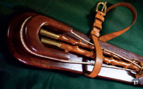Al momento di togliere la corteccia bisognerà incominciare a dare una certa conicità al bastone, e quindi servono: una lima, carta vetrata, olio di gomito, molta pazienza e tempo…. A questo punto incominciano i trattamenti del legno, con oli e sostanze varie per proteggere il legno dai tarli e dalle spaccature causate dall’umidità, una frusta viene usata anche in giorni di pioggia. Ogni artigiano ha le sue ricette e procedure, è un passaggio fondamentale e lungo perché il legno deve ricevere vari strati di oli e asciugare completamente, non si può avere fretta. Non mi piace usare prodotti chimici, hanno il difetto di non penetrare in profondità nel legno e diventare parte di esso, cosa che fanno i vari tipi di oli. Per la colorazione del legno, personalmente preferisco i colori della tradizione, quelli che vedo nelle vecchie fruste in musei e collezioni, dal giallo “Swaine & Adeney” (il più famoso costruttore inglese) a 2-3 gradazioni di marrone, qualche volta il nero, che è pur sempre un colore elegante. Una volta trattato e colorato il nostro legno arriva alla lucidatura finale, che può essere lucida con gommalacca o in “patina” con varie cere per un aspetto meno brillante, come quello delle vecchie fruste ben conservate. Devo ringraziare i restauratori e i liutai che ho incontrato negli anni che mi hanno aperto, almeno in parte, le porte della loro arte.