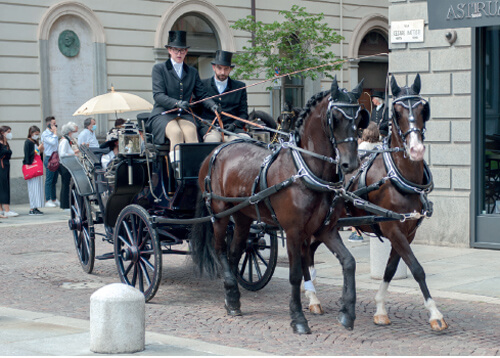 Un evento che si è svolto il 24 giugno, proprio in occasione della festa patronale di San Giovanni e dopo più di 40 anni dall’ultima sfilata di carrozze per le vie della città di Torino. Apriva il corteo attraverso i Giardini Reali Bassi Marco Gentile con il suo Park Phaeton di Cesare Sala (1880), attaccato in pariglia a due haflinger con finimenti di Moirano antichi di almeno cinquant’anni, neri con metalli in ottone.