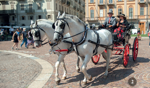 A seguire il legno di splendida bellezza di Valeria Nicolotti, con impeccabile livrea, alla guida di un Landau del piemontese Locati risalente al 1870, carrozza di servizio attaccata in pariglia a superbi frisoni. La sfilata proseguiva verso Piazza Castello e Piazza Carlo Alberto: ecco Bruno Monero, perfetto cocchiere, presente col proprio lussuoso Milord Muhlbacher del 1900. Di seguito Mario Mautino a cassetta di un Landau firmato Cesare Sala (TO) del 1850 circa, sui quali divanetti graziose signore inclinavano il capo ai saluti dei cittadini plaudenti e meravigliati.