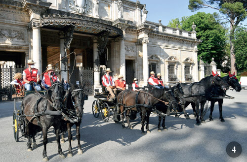 Protagonisti di questo viaggio sono, innanzitutto, i cavalli, tutti di razza Italiana e nati in Italia: Corato & Impetuoso, due Murgesi: l’uno di Locorotondo (BA) di manto testa di moro con criniera folta e lunga 170 cm, di proprietà di Simona Alfano. E’ un cavallo dedito alla carrozza, ma bravo anche a sella. L’altro Murgese e’ di Martina Franca, di colore nero, addestrato presso la Masseria Grottillo. Il suo lavoro è la carrozza, ma non disdegna la sella ed è di proprietà di Claudio Tronci.