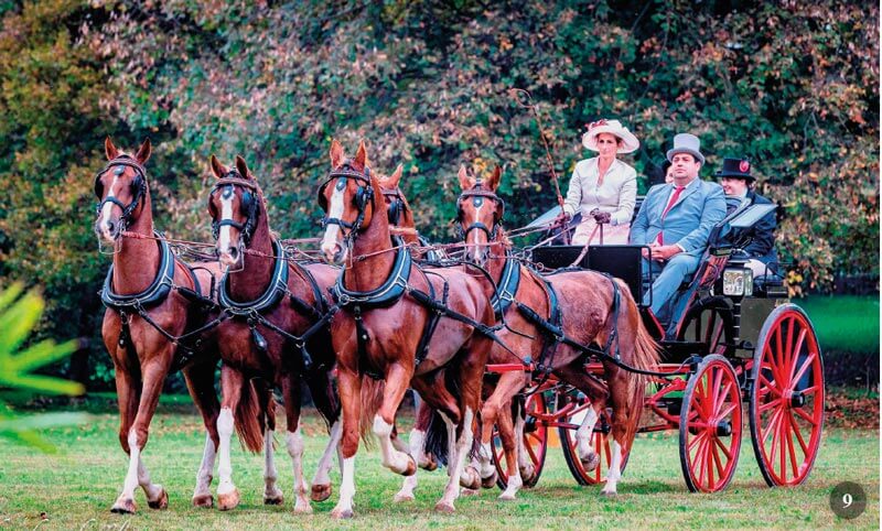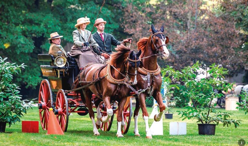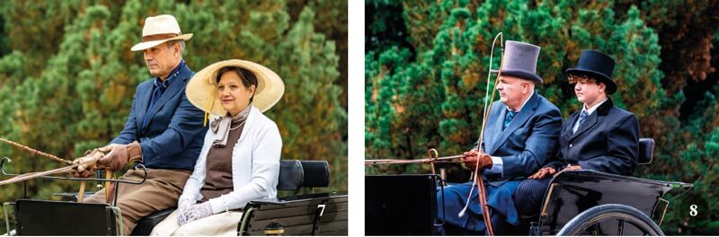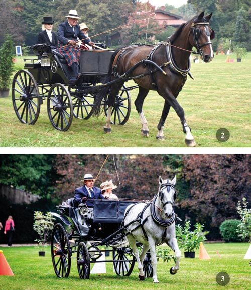 Sedici attacchi in gara con pregiate carrozze originali, cavalli impeccabili e passeggeri con abiti elegantissimi. Il cocchiere di casa Zoltan Kis fa il suo ingresso con uno dei gioielli della collezione di carrozze di Dino Crippa. Si tratta di una elegante Caléche datata 1870, a firma Cesare Sala e attaccata a una coppia di cavalli grigi, uno Andaluso e l’altro Lusitano. Il restauro risale ad oltre 50 anni fa. Elegantissimi e soddisfatti i passeggeri, in carrozza con un delizioso barboncino. Segue una Dottorina dei primi del ‘900, modello con serpa, presentata da Gregorio Lattanzi. Veniva usata dai professionisti, in particolare veterinari e medici, per recarsi a fare le visite. Costruttore sconosciuto e restauro appena concluso.