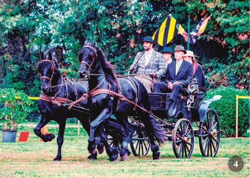 Antonio Mottin avanza con un nuovissimo acquisto: un Dog Cart di produzione inglese firmato E.Pass di Salesbury, come testimonia la scritta sui mozzi delle ruote. Leggero e maneggevole è attaccato ad un pony Haflinger. La signora a fianco del guidatore è opportunamente abbigliata per una gita di piacere. La carrozza è di recentissimo restauro. E’ la volta di Ruth Wünderlin- Messmer a rappresentare la Svizzera con il suo Singolo Freiberger. Si presenta con un tipico costume tradizionale svizzero alla guida di un Break Bernese in legno naturale del 1910 e restaurato nel 2010.