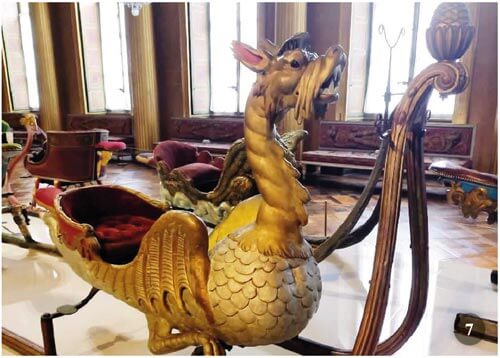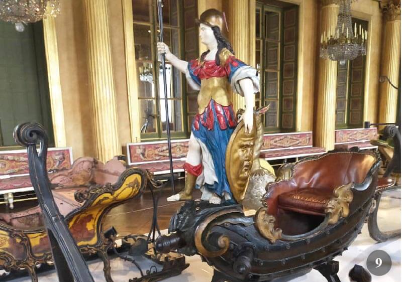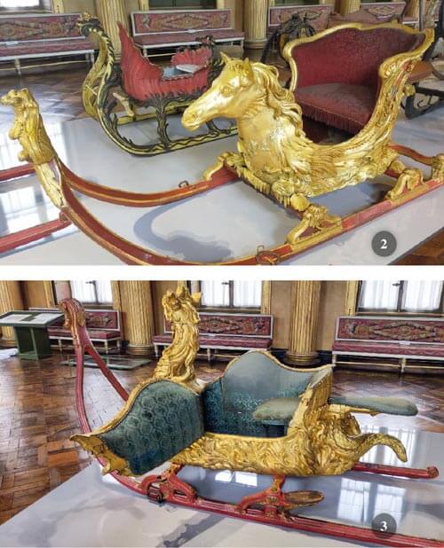 Nella grande galleria da ballo slitte con forma di grifoni alati, cavallucci marini, draghi, aquile danno vita a una sarabanda, che ricorda le antiche sfilate principesche e riportano a tempi lontani, quando la neve ricopriva nei lunghi mesi invernali i sentieri di Versailles e re, principesse e cortigiani amavano andare in slitta, meglio ancora, scivolare lungo il Grande Canal ghiacciato.