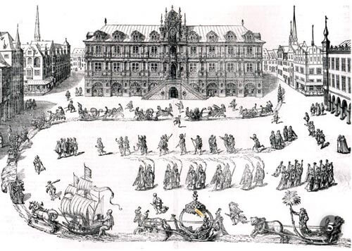 - Sfilata di slitte cerimoniali: i principi conducono dame magnificamente abbigliate in slitta, attraversando la città e girando intorno alla piazza illuminata da fiaccole. (Ducato del Württenberg-Germania).