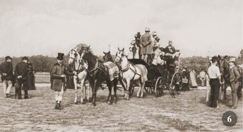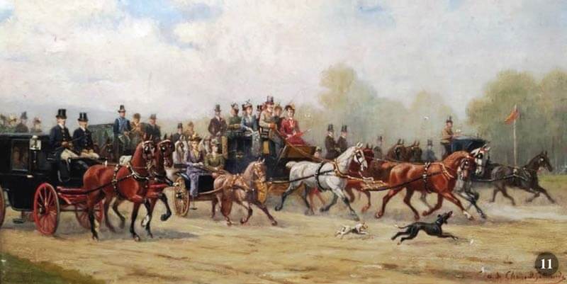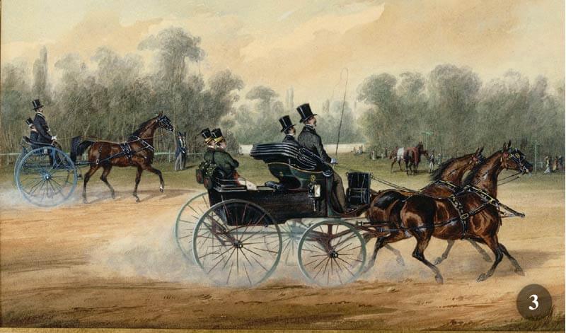 Napoleone III, amante dei cavalli, approvò la nascita della Société Hippique Française e le conferì il riconoscimento ufficiale il 16 ottobre 1866. Le corse dei cavalli erano una passione di nobili e di ricchi in Francia. Il Jockey Club de Paris, club per gentiluomini, considerato il più prestigioso a Parigi, organizzò le prime corse di cavalli. Questa era l’atmosfera di Parigi, quando il consiglio comunale autorizzò la costruzione di un nuovo ippodromo ad Auteuil, nel Bois de Boulogne, nel 1873. La denominazione di questo ippodromo dice tutto: “Le Temple de l’Ostacle”. Anche oggi, Auteuil è l’unico ippodromo a Parigi e dintorni che organizza eventi di corsa ad ostacoli, alcuni dei quali di fama mondiale. La tradizione di recarsi alle corse in coach ha origine in Inghilterra, dove dall’inizio i Coaching Club ottennero privilegi, tribune o aree private in occasione di importanti corse di cavalli, come Ascot, Sandown Park, Kempton Park.