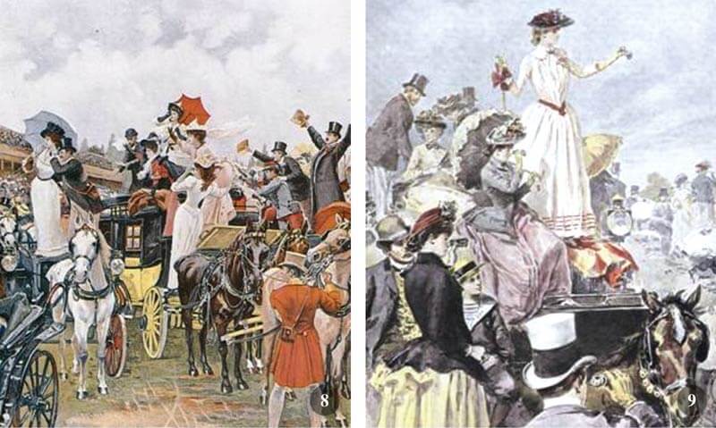 La sfilata partiva alle 13:15 per un percorso di 6 chilometri e arrivava puntuale alle 14:00 all’ippodromo al suono gioioso di una marcia militare. Un tappeto rosso lungo il percorso attendeva gli ospiti eleganti ed illustri, che raggiungevano il Comitato di Gara per la pesatura. Le corse erano un pretesto, non si viene per vedere ma per farsi vedere: l’alta società parigina gareggiava in eleganza.