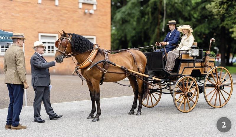 - Luca Burini, alla guida del suo frisone attaccato a un Dos a Dos di fattura francese, si dirige verso la Prova di Presentazione.